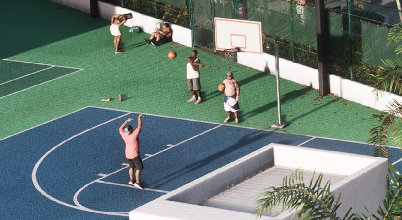 In a screenshot released by Rockstar Games, a group of men are seen playing Basketball on a rooftop court in Vice City. Two of the men are speculated to be