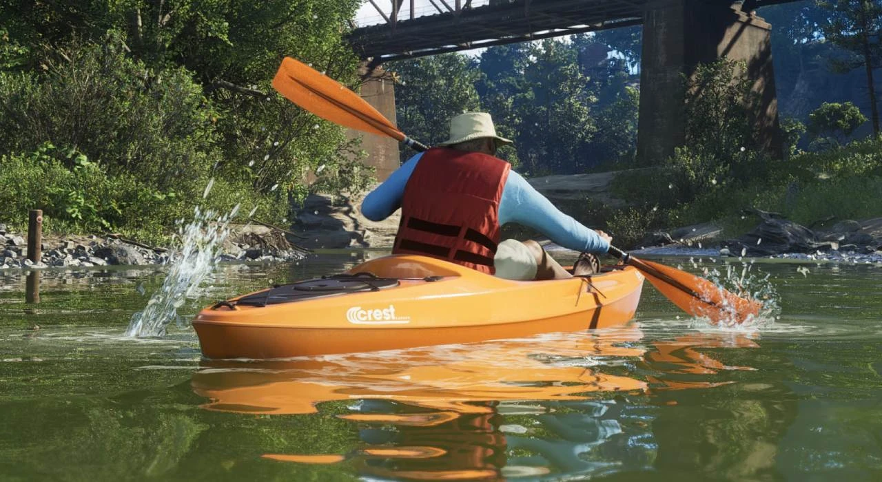 In the image, a character wearing a life jacket is shown in an orange Crest Kayak, making their way along a gentle river in the National Park.