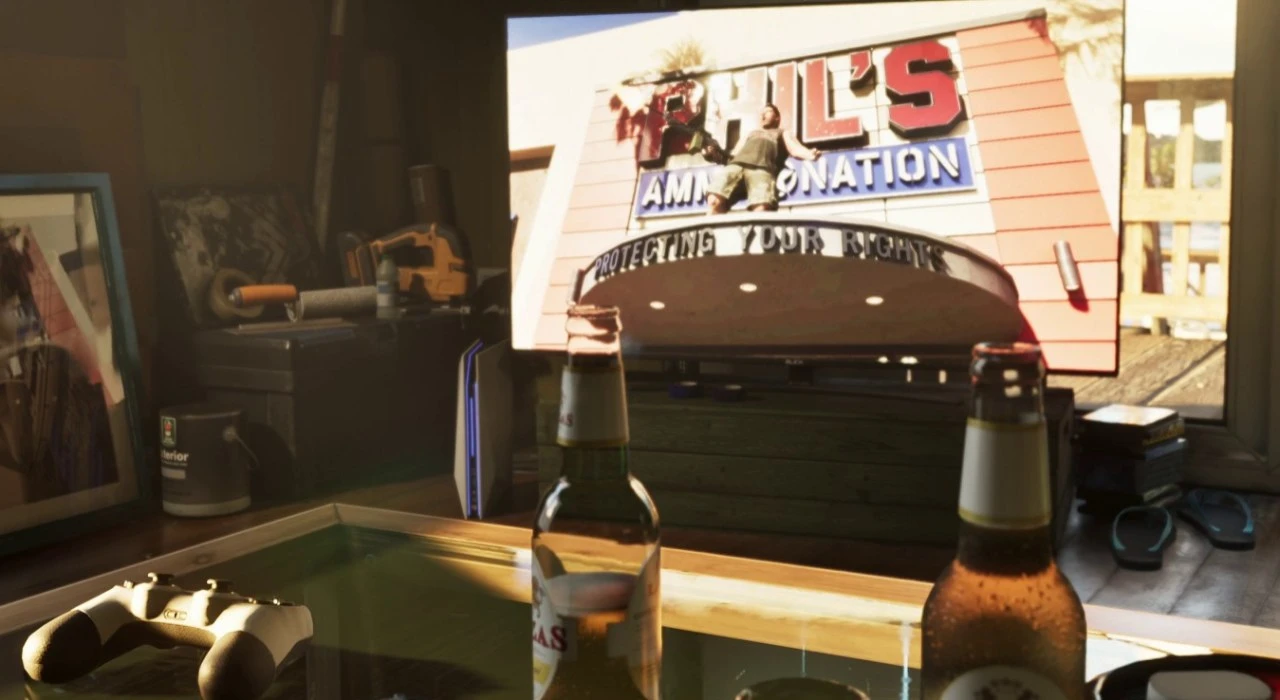 In Trailer 2, Jason is shown to be watching TV when an advertisement for Phil's Ammu-Nation appears on the screen.
