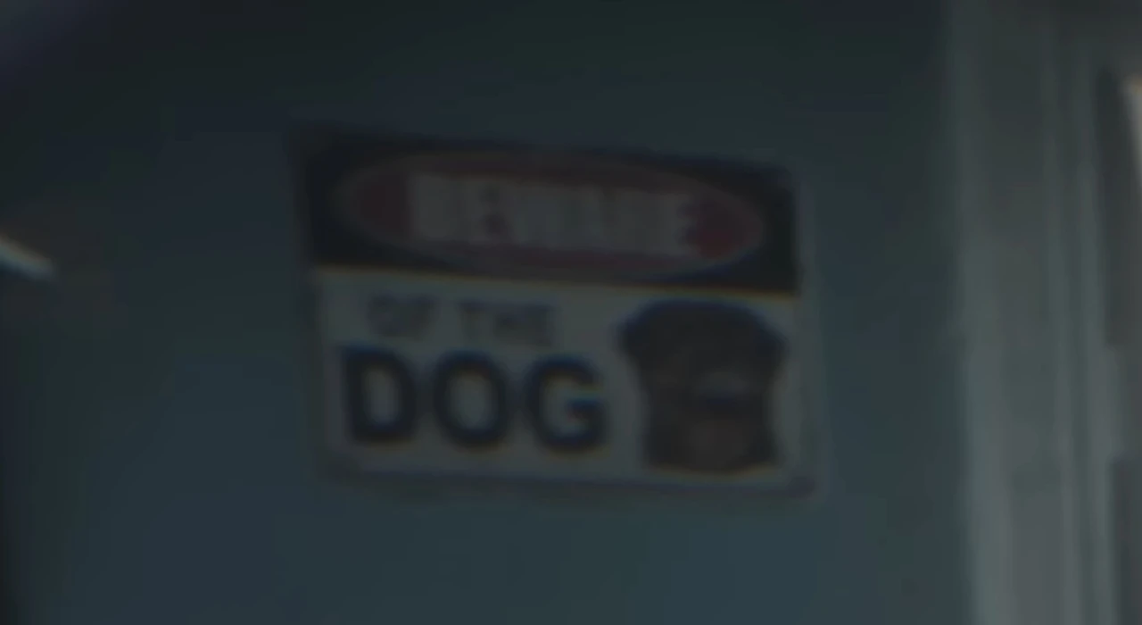 A picture of a Rottweiler appears on a 'Beware of the Dog' sign shown during a police raid in Trailer 1.