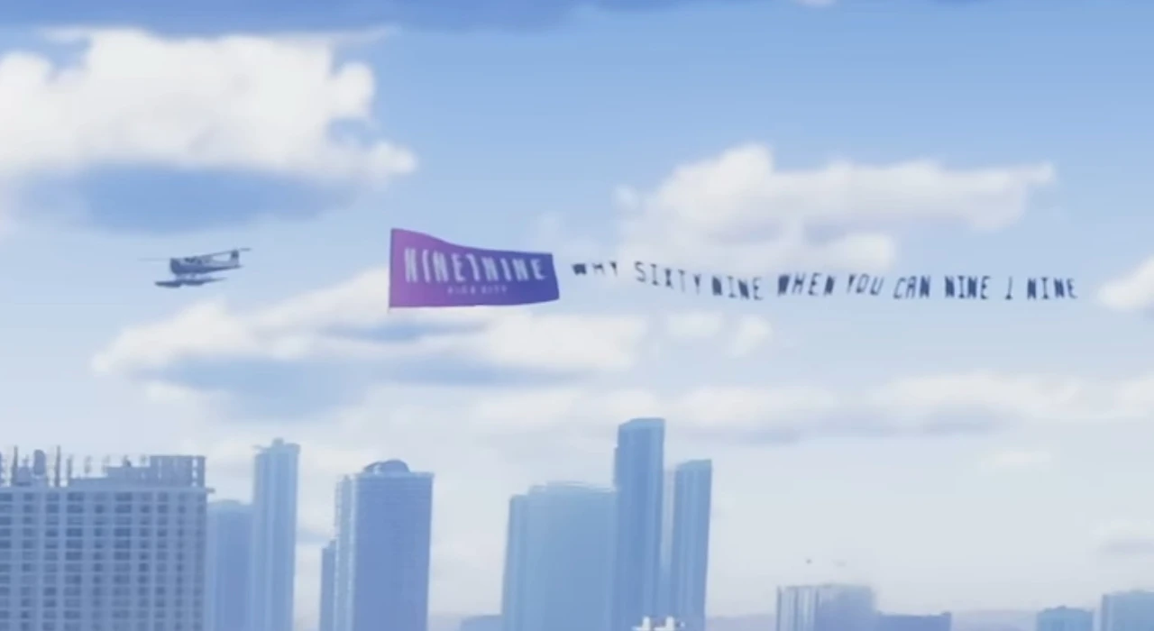 In Trailer 1, the banner flown over Vice Beach reads: “WHY SIXTY NINE WHEN YOU CAN NINE 1 NINE.”