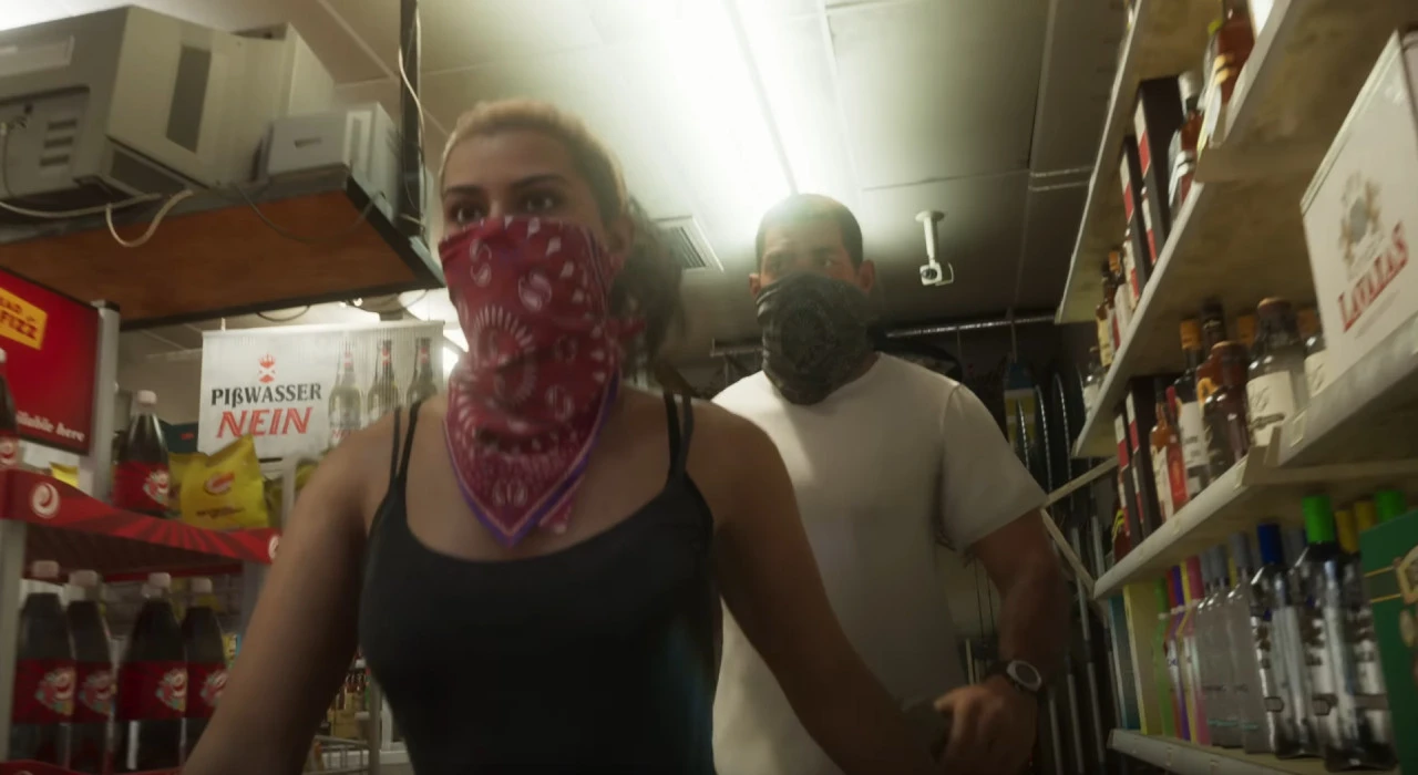 First, the GTA 6 protagonists are shown walking through the store wearing bandanas over the lower portion of their faces. Next, we see a clip from earlier in time, where the duo burst through the shop’s front doors and point their guns at those inside.