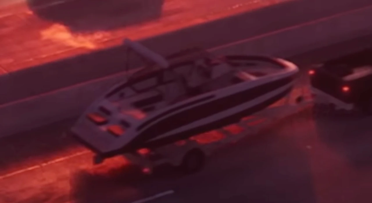 The Crownline-inspired vehicle can be spotted in the opening seconds of Trailer 1, being towed on a trailer behind a Bobcat XL.