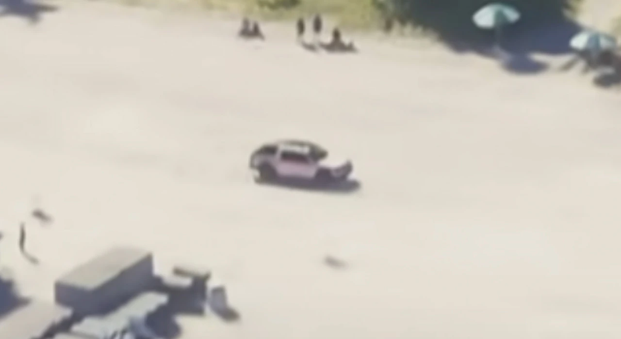 Later, the vehicle can be seen again, behind multiple beachgoers on a crowded beach.