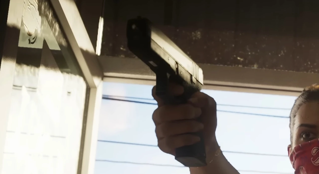 Jason Duval in one image. Another screenshot reveals Lucia holding the pistol inside a residence as an armed assailant approaches the door.